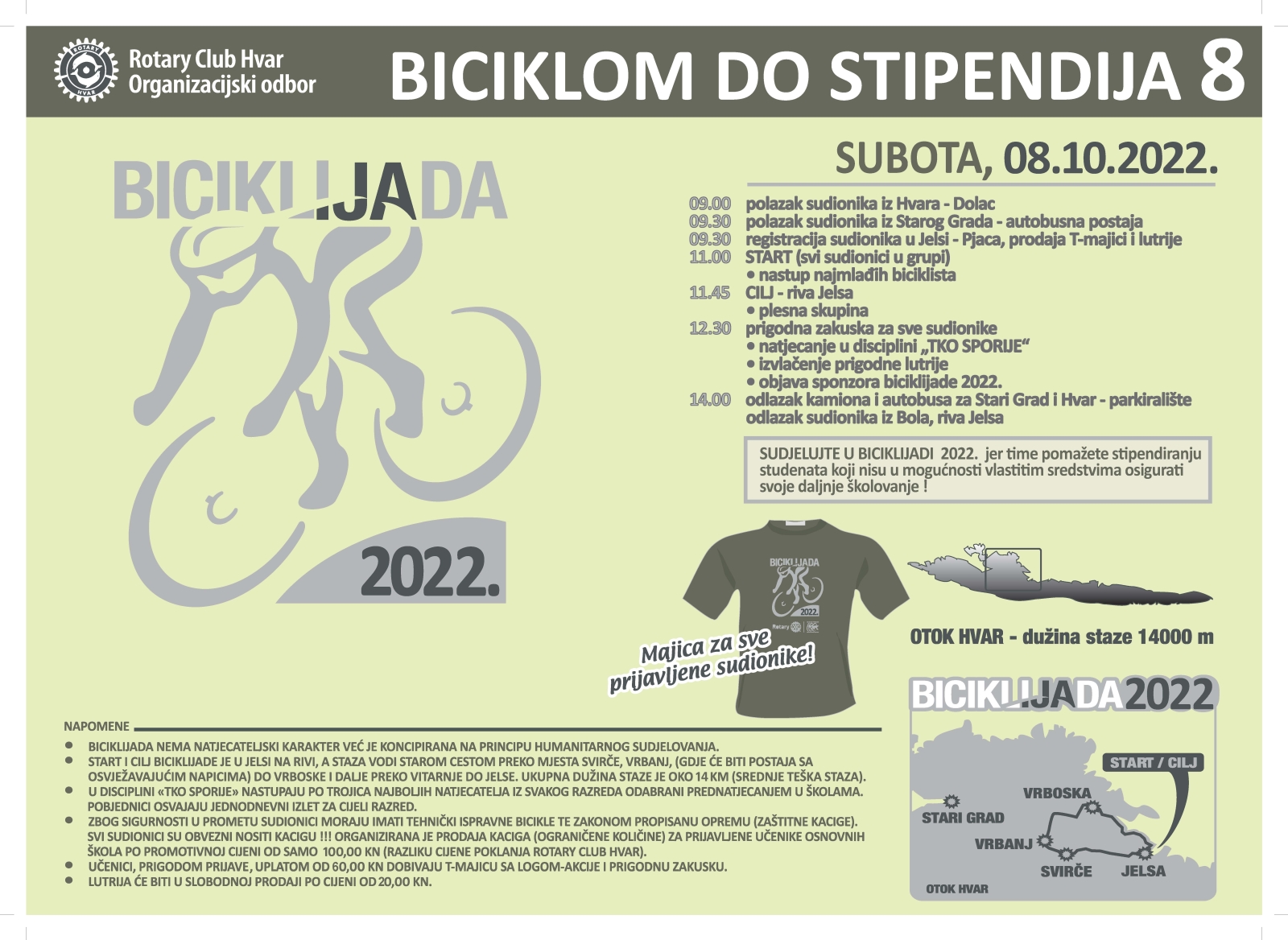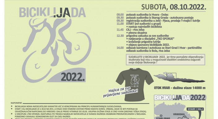 HrvatskaRotary klub Hvar organizira, dana 8. listopada 2022. godine (subota), tradicionalni dobrotvorni biciklistički skup "Biciklijada 2022." pod sloganom "Biciklom do stipendija 8".