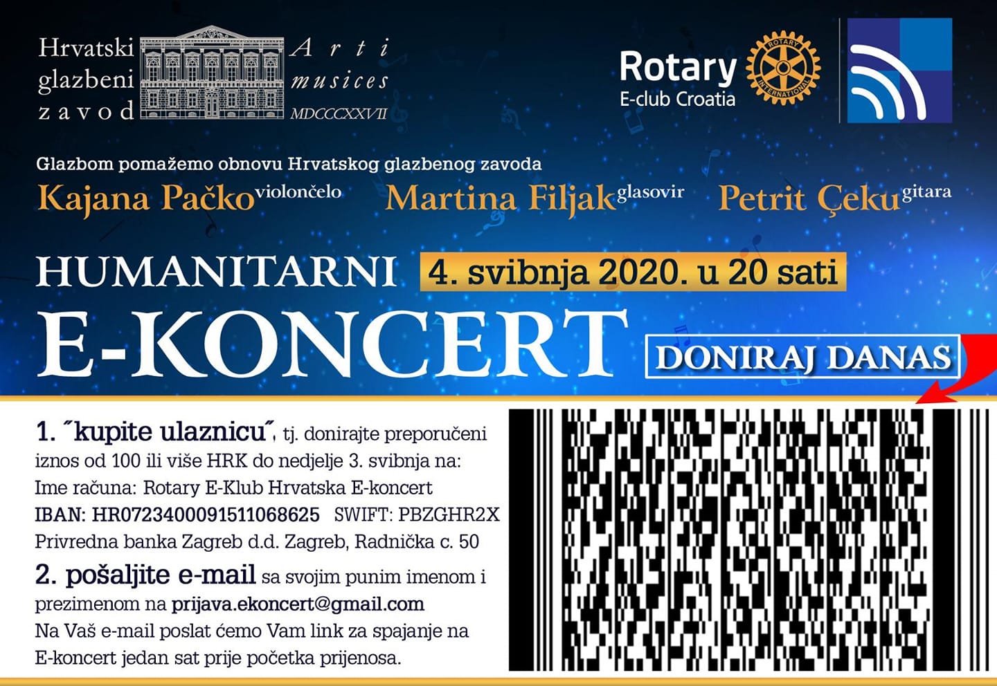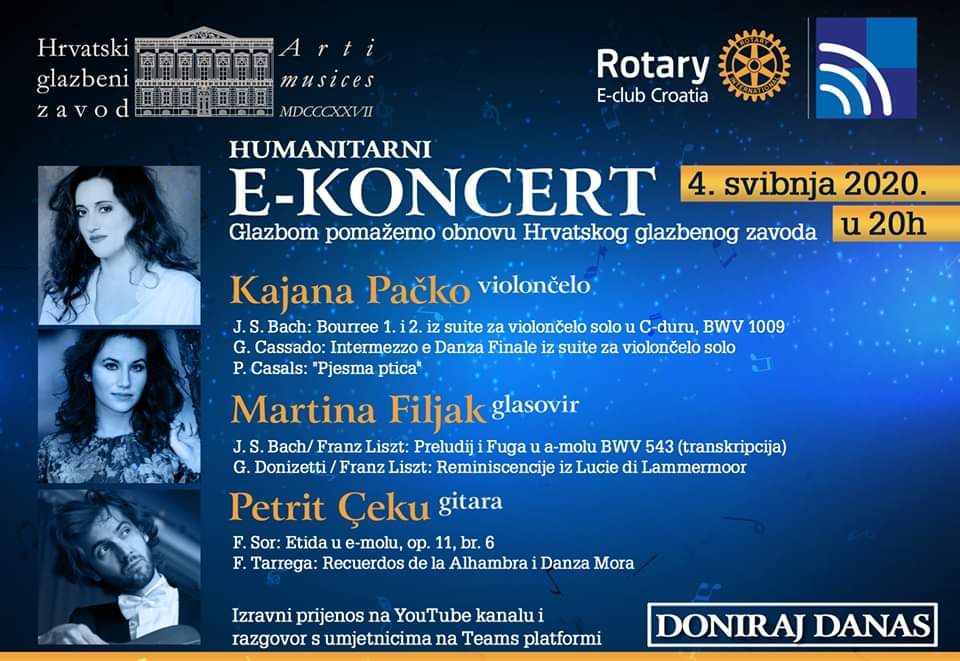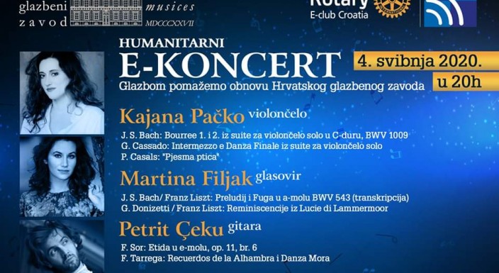 Rotary E-klub Hrvatska Vas poziva na dobrotvorni E-koncert, koji će se održati u ponedjeljak 4. svibnja u 20 sati u izravnom prijenosu na YouTube kanalu.