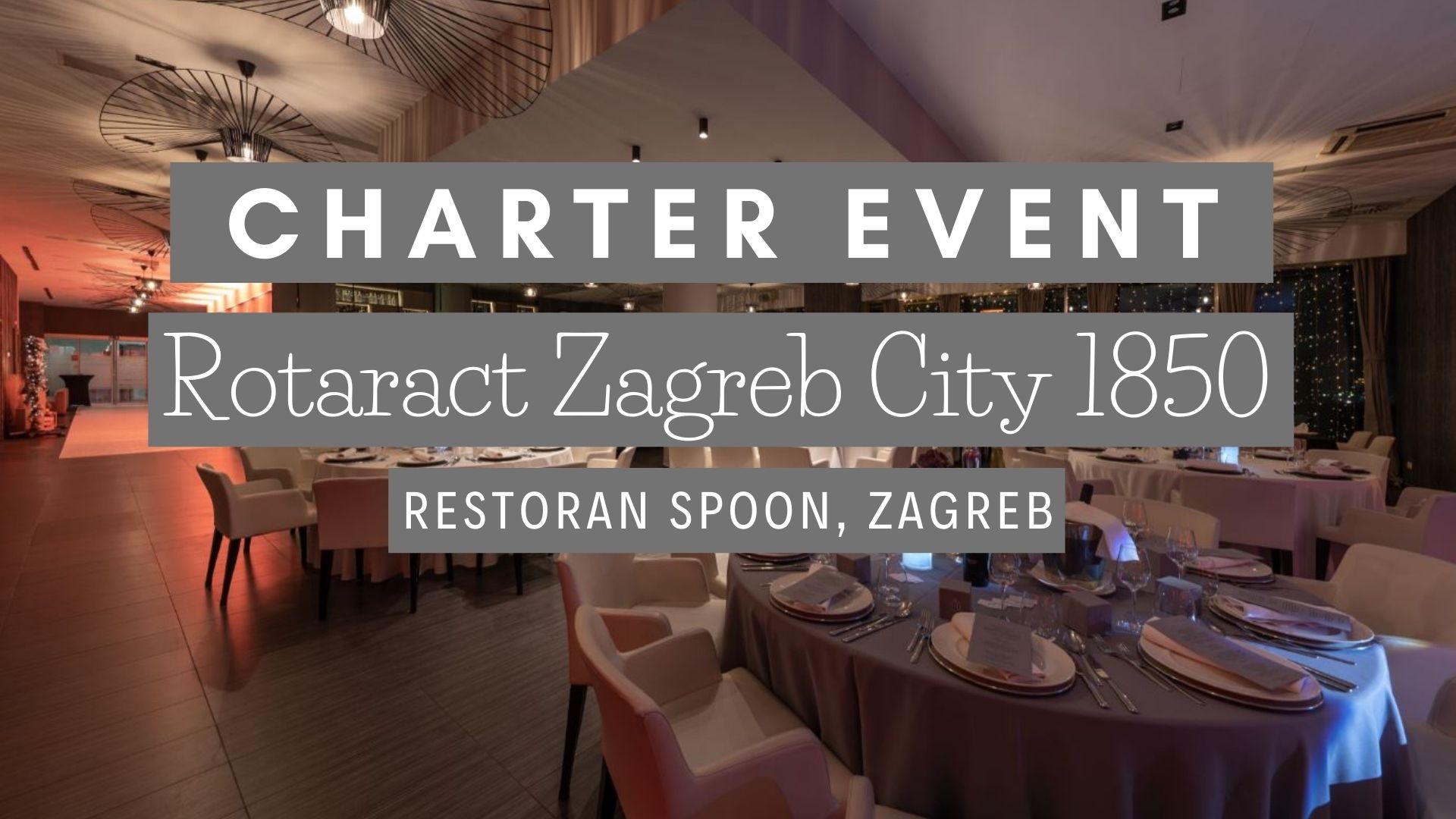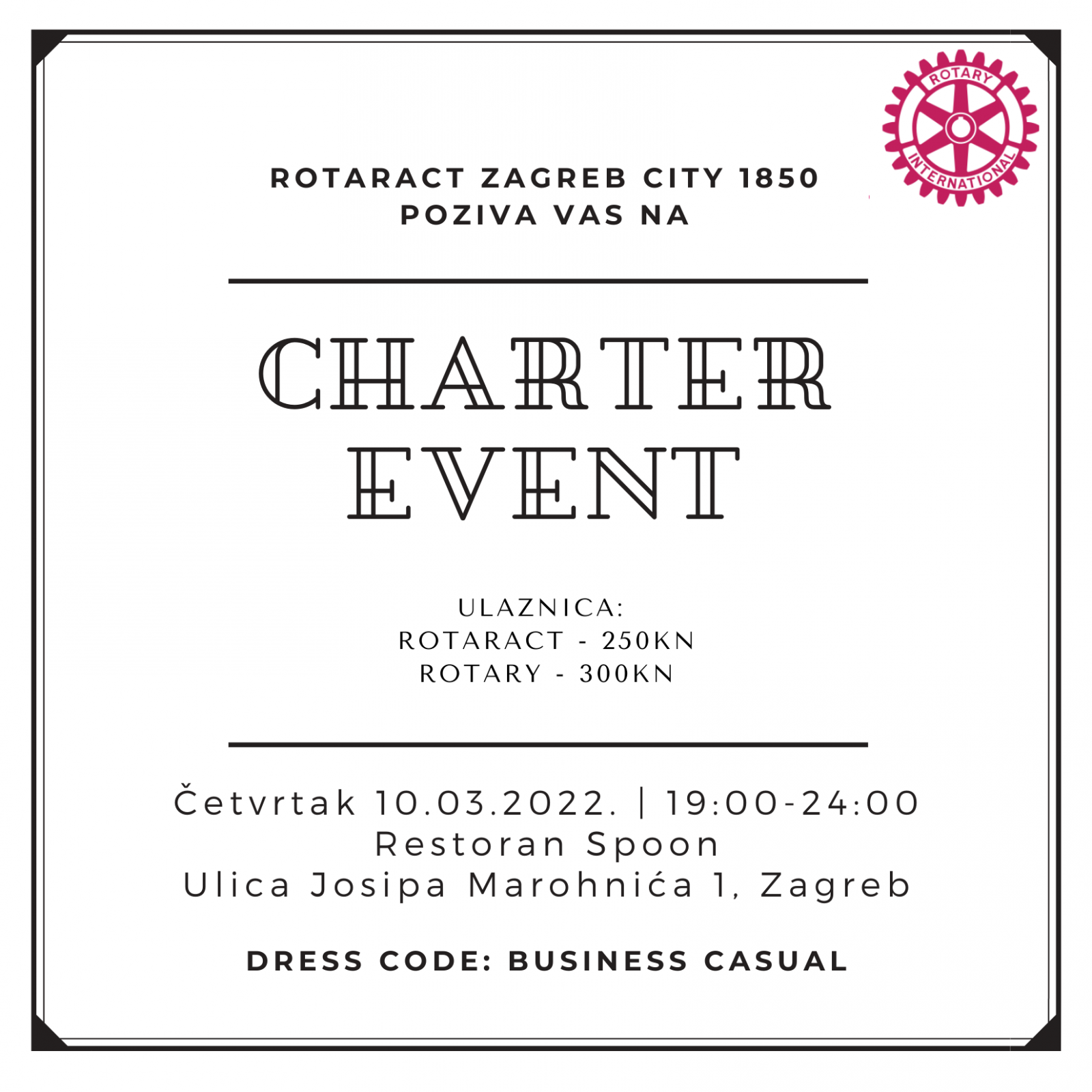 pozivamo vas na svečanu večeru koja je ujedno i Charter Rotaract kluba Zagreb City 1850. Datum večere je 10.03.2022., četvrtak, a održat će se u restoranu Spoon u Zagrebu s početkom u 19:00. Adresa restorana je ulica Josipa Marohnića 1. Epidemiološki razlozi spriječili su nas da charter napravimo ranije, ali sada je red došao na nas. Službeno smo osnovani 14.04.2021. te sada s vama želimo proslaviti naš dolazak u zajednicu.