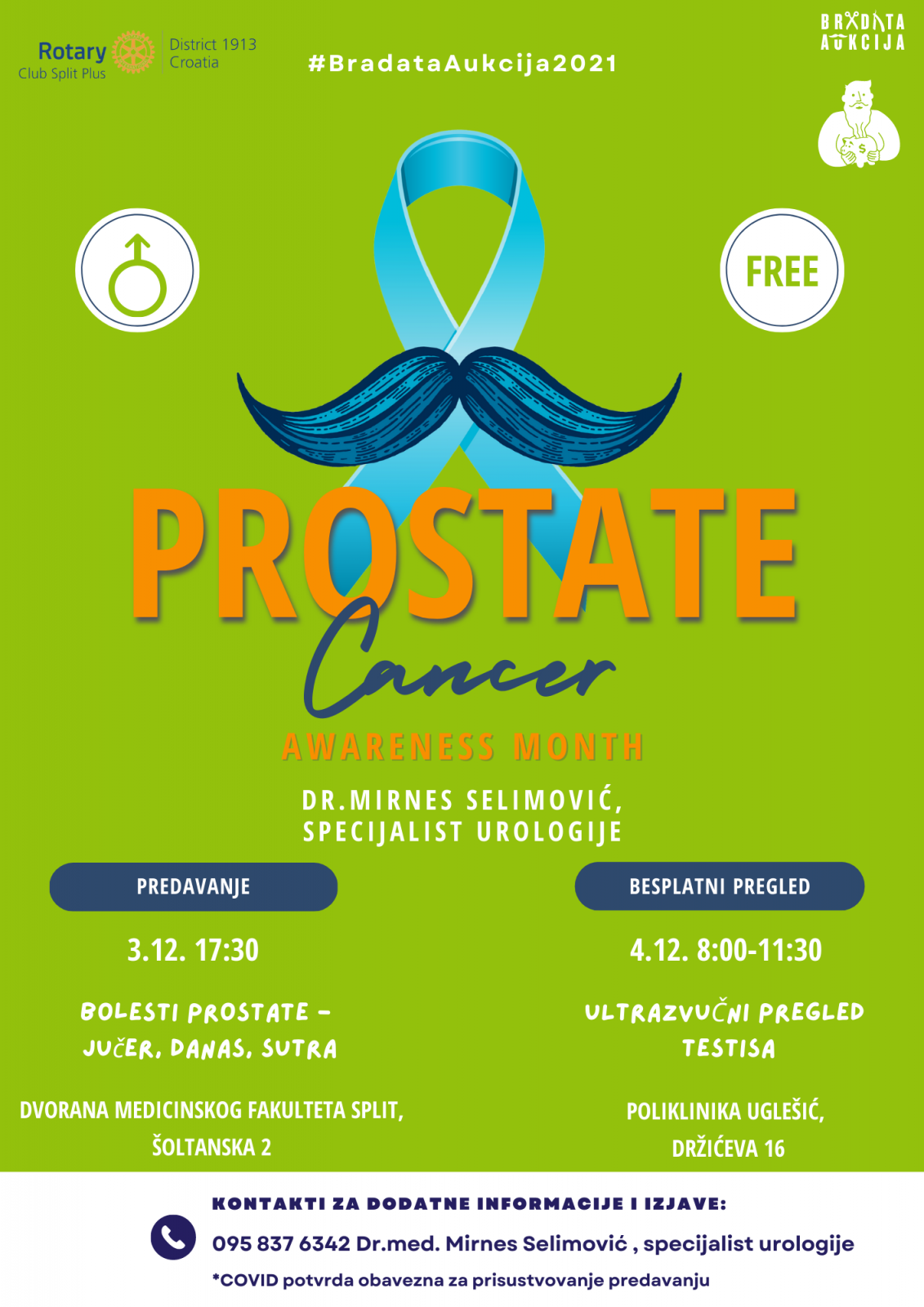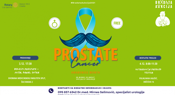 Ovogodišnje izdanje BRADATE AUKCIJE oplemenjeno je sa dva nova sadržaja koje provodi Rotary klub Split PLUS, a za cilj ima poticanje javnosti na edukaciju o važnosti preventivnih pregleda. Zahvaljujući dr.med. Mirnesu Selimoviću, specijalistu urologije, organizira se predavanje na Medicinskom fakultetu o bolestima prostate i besplatan ultrazvuk za muškarce.