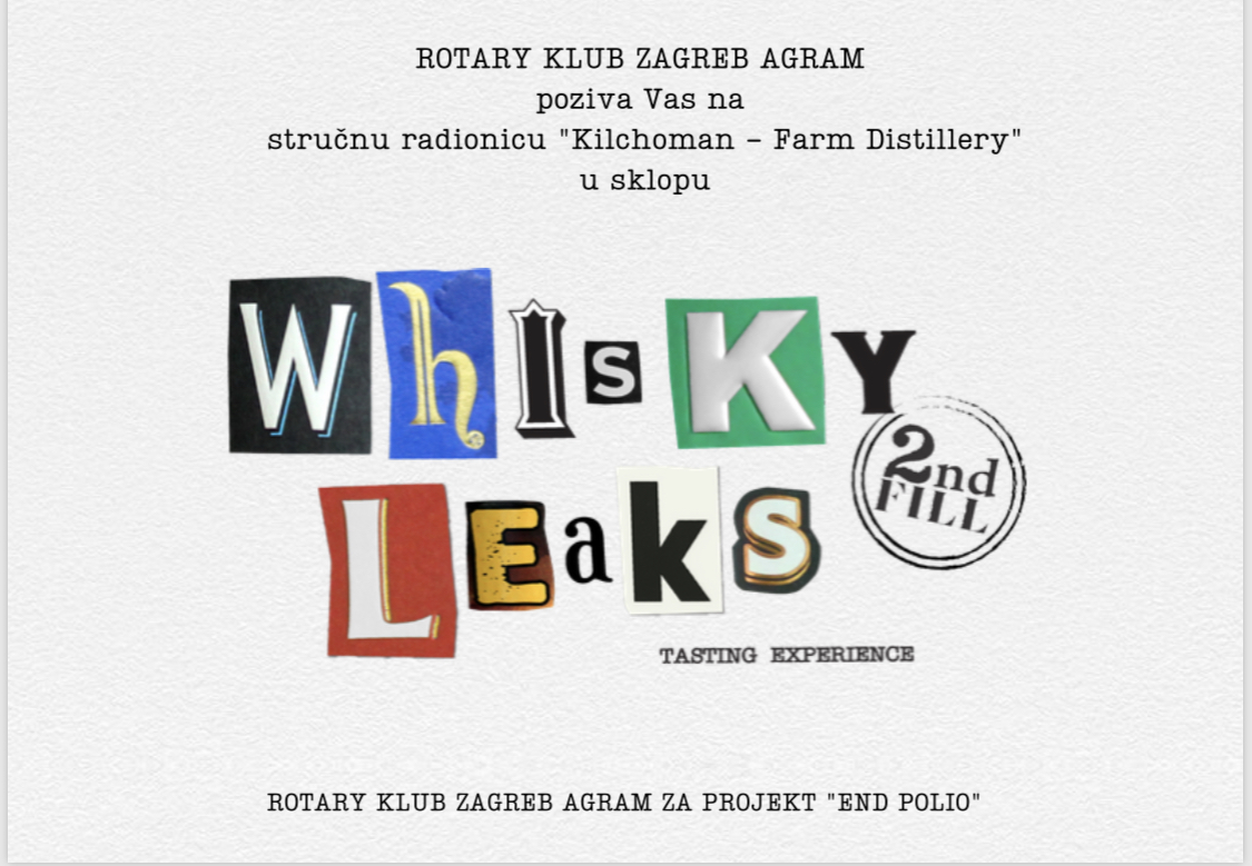pozivamo Vas na stručnu radionicu "Kilchoman - Farm Distillery" koja će se održati u sklopu Whisky Leaks 2nd Fill sajma vrhunskih whiskyja u Hotelu Palace Zagreb. Radionicu, koja je u programu sajma u subotu, 12. listopada s početkom u 12 sati,vodit će Tomislav Ruszkowski, vrsni poznavatelj whiskyja. Cijena radionice iznosi 450,00 kn, a dio prihoda od ulaznica namijenjen je ključnom Rotary projektu na svjetskoj razini -"End Polio" za iskorijenjivanje dječje paralize. Pridružite nam se da zajedno učinimo još jedan korak u ispunjenju ove vrijedne misije.