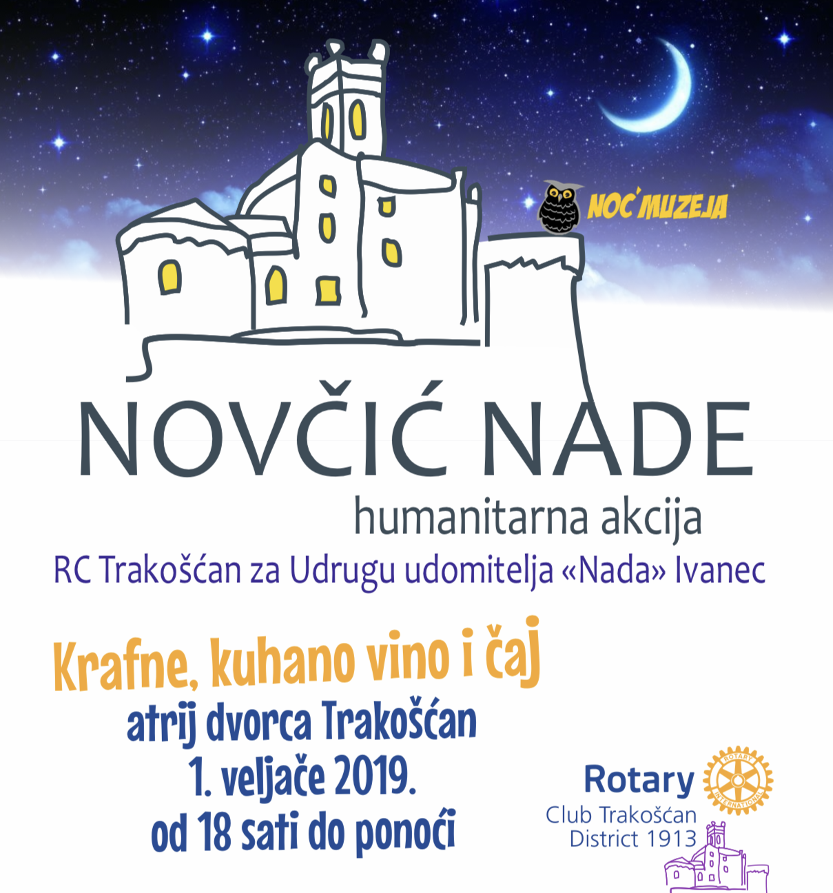 Klub: TrakošćanOrganizator: KlubTip događaja: Club EventDatum događaja: petak, 1 veljače, 2019 - 18:00 do subota, 2 veljače, 2019 - 00:00 Adresa: Trakošćan 1TrakošćanHrvatska. Prilozi: pozivnica_novcic_nade.pdf