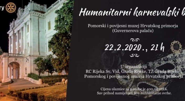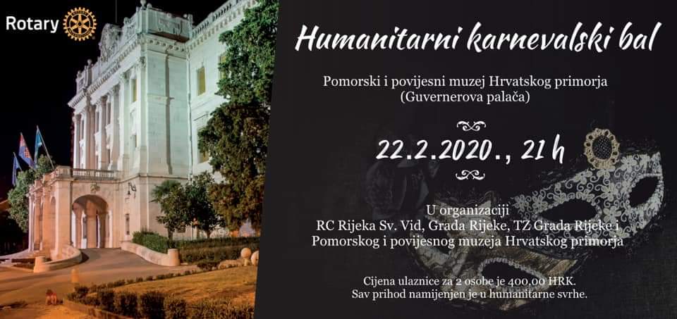 Grad Rijeka, Rotary Club Rijeka – Sv. Vid, Turistička zajednica grada Rijeke i Pomorski i povijesni muzej Hrvatskoga primorja Rijeka pozivaju Vas da s pratnjom prisustvujete Humanitarnom karnevalskom balu, koji će biti održan u subotu, 22. veljače 2020. godine u 21 sat u palači Pomorskoga i povijesnoga muzeja Hrvatskoga primorja Rijeka (Guvernerova palača), Trg Riccarda Zanelle 1.