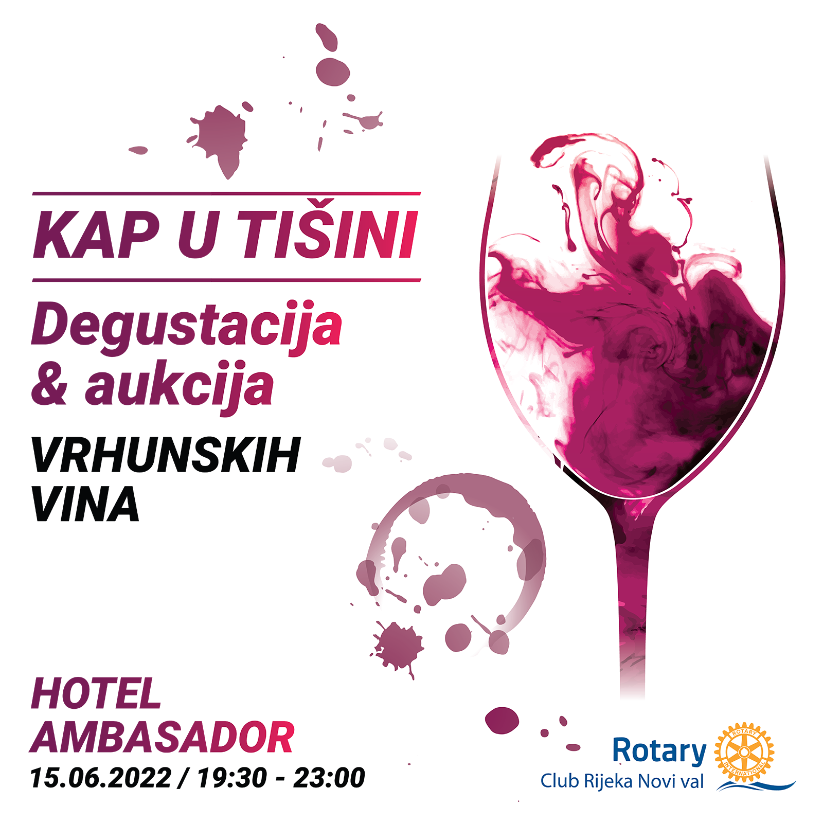 RC Rijeka Novi val organizira degustaciju i aukciju vrhunskih vina naziva "Kap u tišini". Potonji event će se održati u srijedu 15.06.2022. godine, s početkom od 19:30 h, na terasi hotela Ambasador u Opatiji.