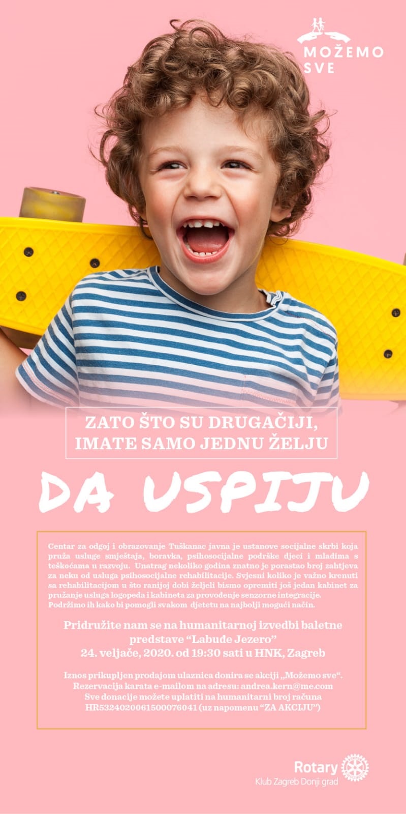 Pozivamo Vas da donacijama na humanitarni račun ili kupnjom karte i dolaskom na ovaj prekrasan balet, koji se izvodi već 143 godine, podržite našu akciju i pomognete opremiti ustanovu koja pruža rehabilitaciju svojim štićenicima i djeci iz cijele Hrvatske koja im dolaze na terapiju.