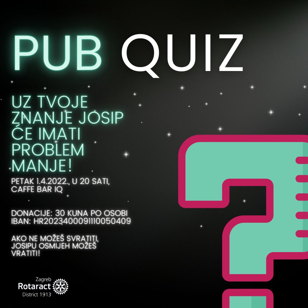 Rotaract klub Zagreb ove godine ponovno održava, drugi po redu, Pub quiz “Uz tvoje znanje, Josip će imati problem manje!” koji će se održati 01. travnja 2022. godine s početkom u 20:00 sati.