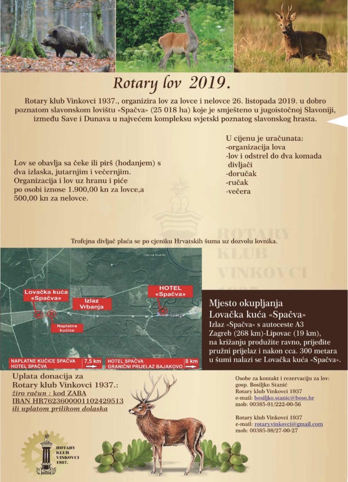 HrvatskaRotary klub Vinkovci 1937., organizira lov za lovce i nelovce 26. listopada 2019. u dobro poznatom slavonskom lovištu "Spačva" (25 018 ha) koje je smješteno u jugoistočnoj Slavoniji, između Save i Dunava u najvećem kompleksu svjetski poznatog slavonskog hrasta.