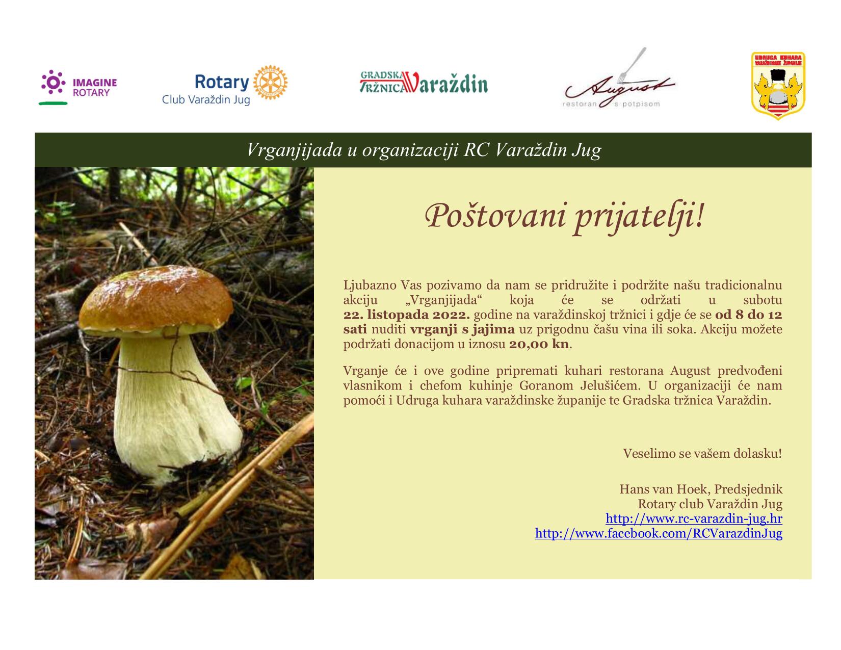 22. listopada 2022. godine na varaždinskoj tržnici i gdje će se od 8 do 12 sati nuditi vrganji s jajima uz prigodnu čašu vina ili soka. Akciju možete podržati donacijom u iznosu 20,00 kn.