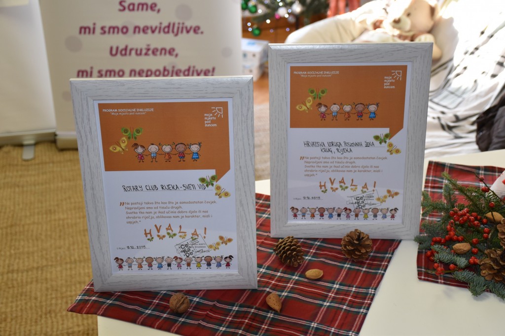 Primopredaja donacije je upriličena u prostorijama udruge „Centar za kulturu dijaloga“ u Rijeci, dana 10.studenog 2019. godine, a simboličan ček voditeljici programa „Moje mjesto pod suncem“ Sandri Grozdanov, uručile su predsjednica riječkog ogranka Hrvatske udruge poslovnih žena Krug, Gordana Nikolić i tajnica Rotary cluba Rijeka-Sv.Vid, Amira Predovan.
